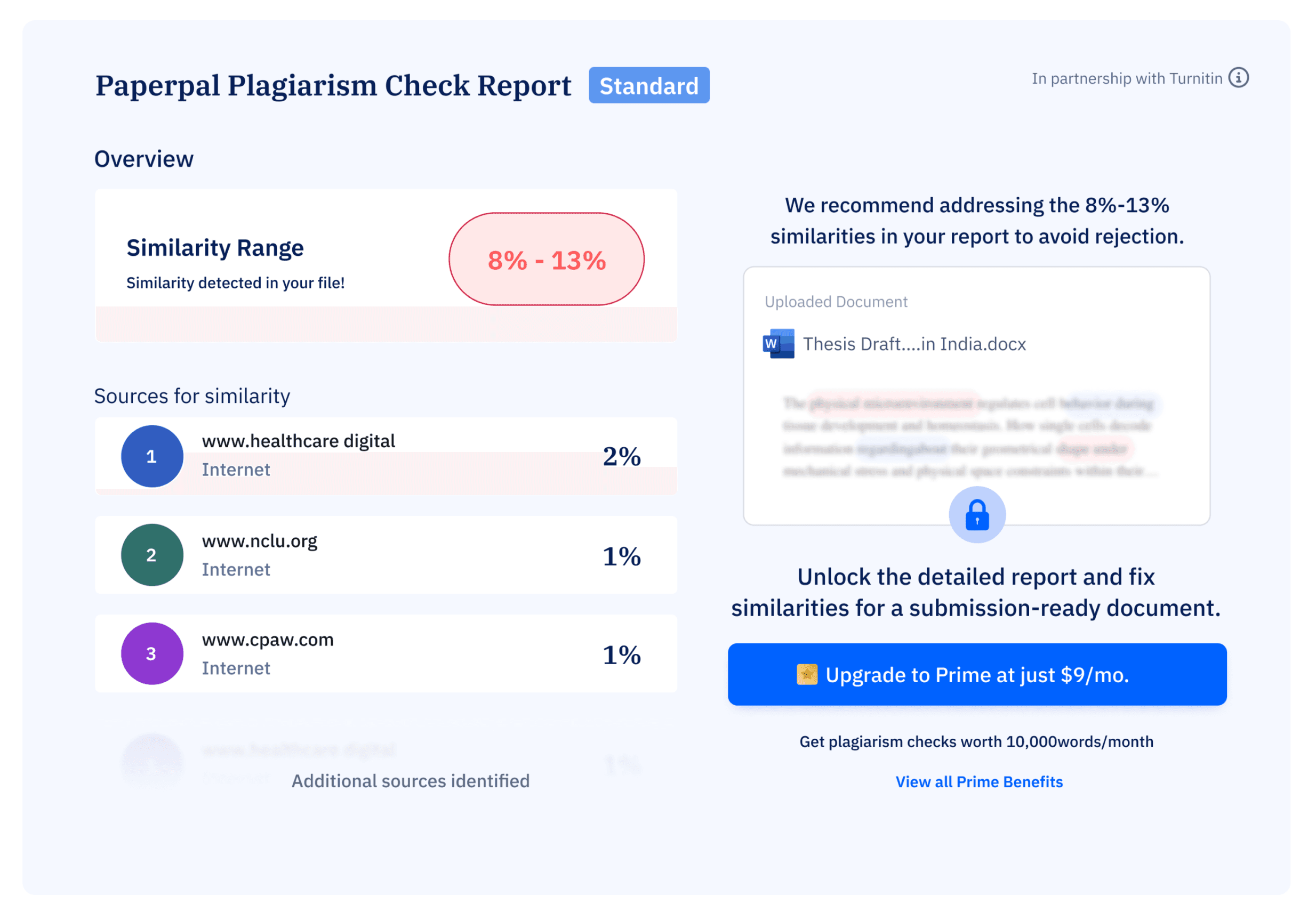 Quickly comprehend plagiarism insights, such as matching sources and similarity percentages.