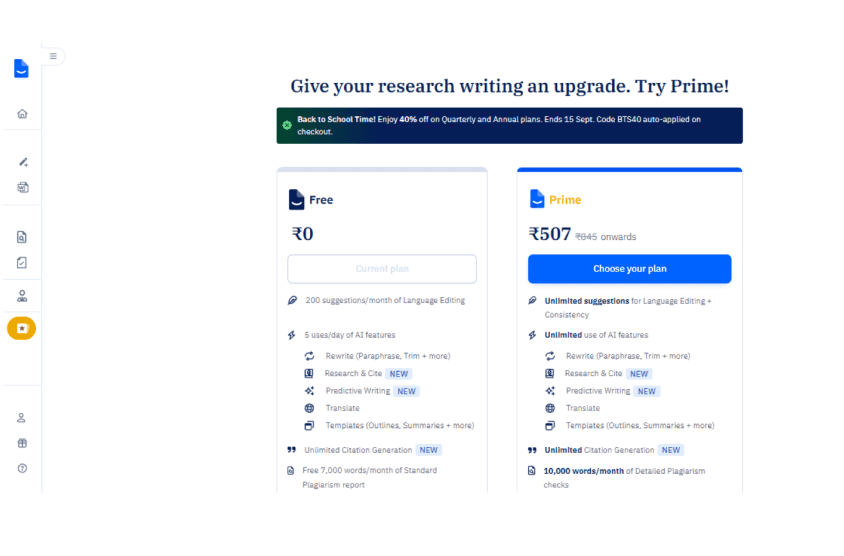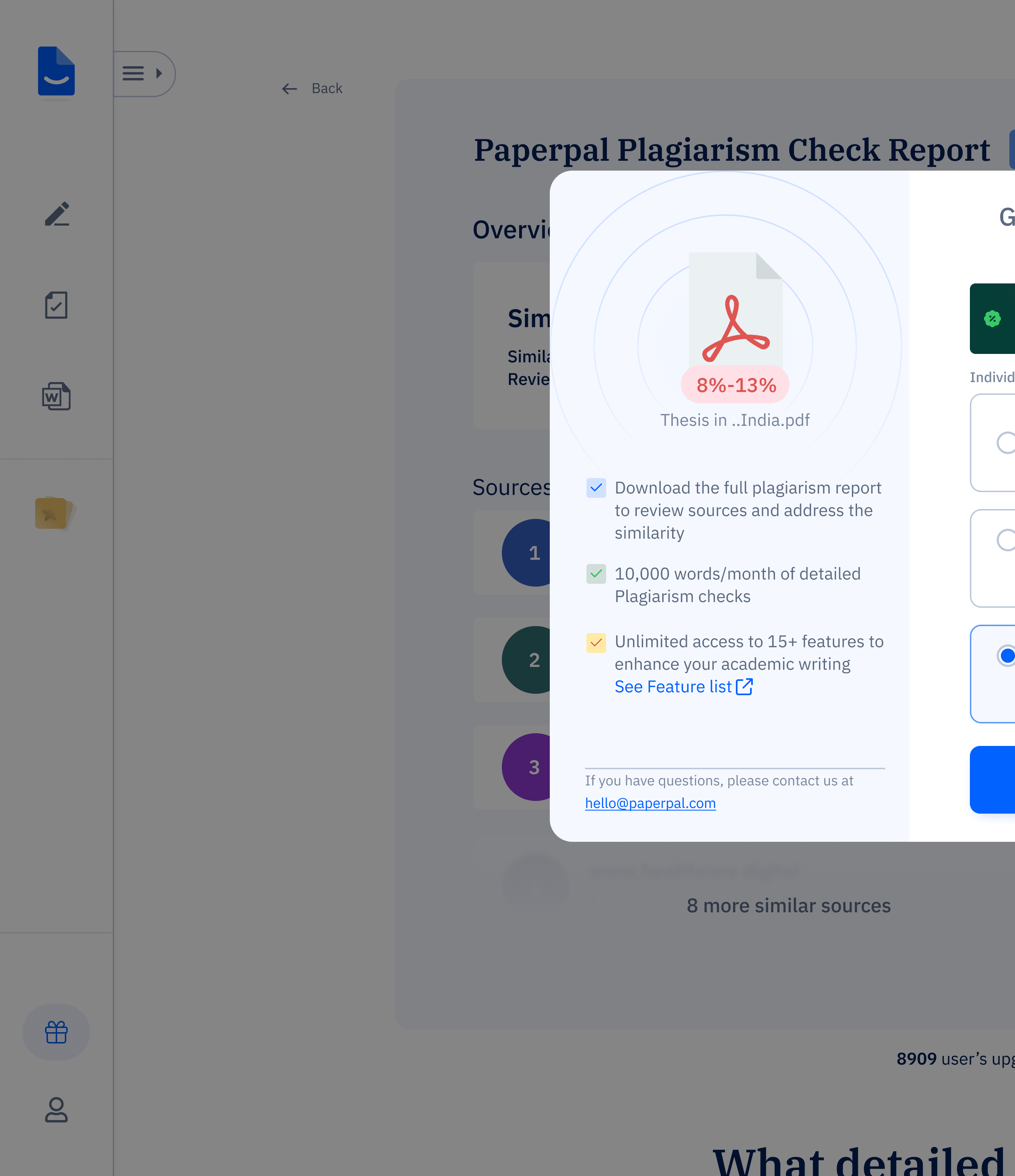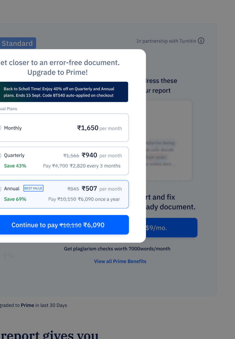 Contextual Relevance: Plan selection is integrated into a pop-up linked to the plagiarism check, maintaining user attention on the task at hand.