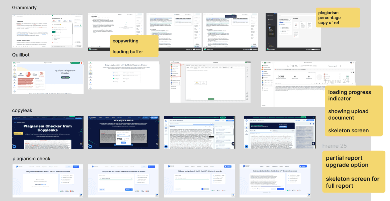 We began the project by analyzing other academic assistant platforms, focusing on their patterns, user experiences, and strategies for nudging users toward conversion. We studied products like Grammarly, Quilllbot, Copyleak, Plagiarism checker.